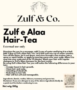 Directions for use: In a saucepan, add 2 cups of water and bring it to a boil. Add 2 tbsp of Zulf e Alaa Hair Tea. Let it boil until one cup of water remains. Turn off the flame, let it cool down, and sieve through a tea strainer into a spray or squirt bottle, or apply by pouring warm over your scalp. Allow it to seep into your scalp and sit for 15 minutes. Wash your hair with regular shampoo or Zulf e Alaa shampoo for the best results.